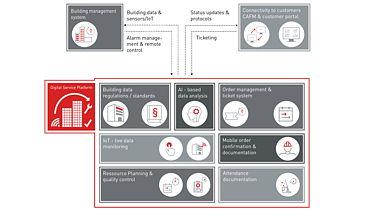 Instead of conventional - usually manual - recording of building status information and consumption meters, we rely on sensor/actuator technology and the connection of building management systems to our Digital Service Platform. This allows us to eliminate media disruptions and ensure transparency as the basis for measures and possible applications for the efficiency-enhancing downstream automation of processes.
